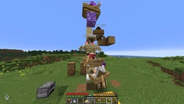 MumboJumbo placed a crafting table to mark the creation of a new district and GoodTimesWithScar placed a torch on it. A boat was then put atop the torch, with a purple bed on top of it. Boats were then placed on every other block, with support blocks being beds, a grindstone, and an amethyst block. MumboJumbo dubbed it the "Boatem Pole", a pun on the words "boat" and "totem pole."