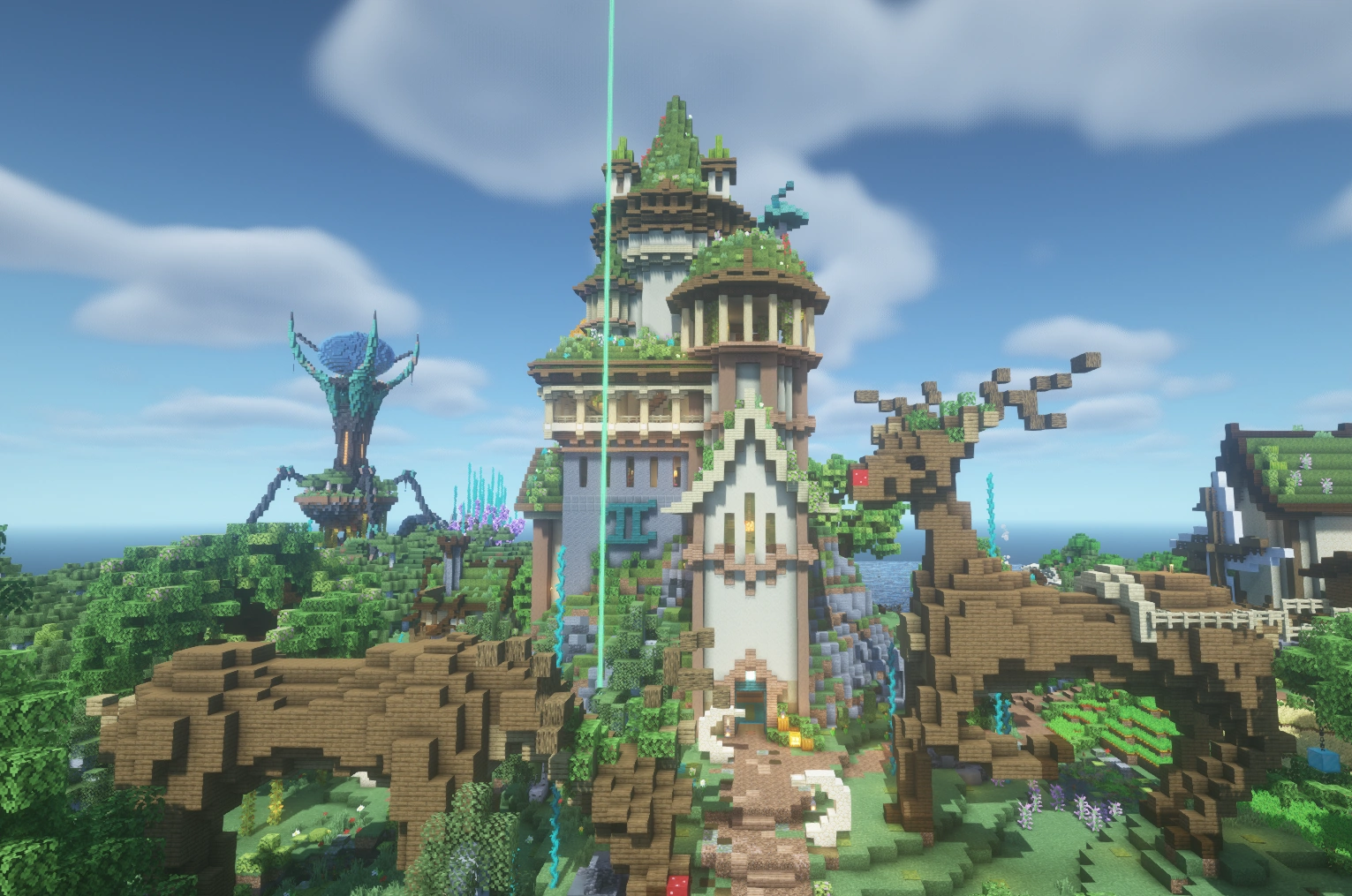 Made out of sandstone, stone, brown mushroom, and moss blocks, the Palace consists of primarily neutral colors, the highlight being the verdant roofs. Two organics, wooden deers, surround the area, along with other smaller structures like a windmill, well, etc.