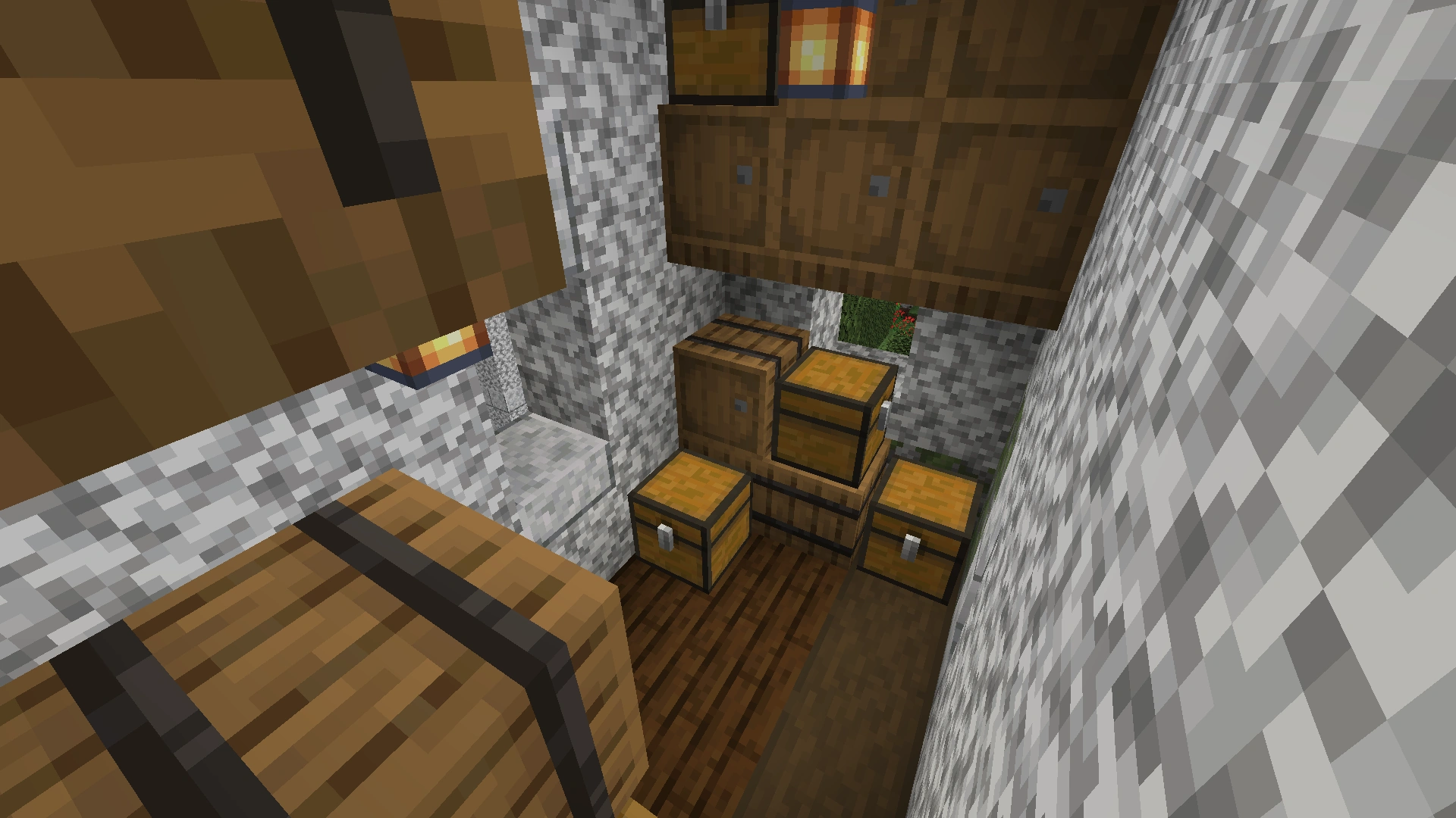 A cramped room filled with crates and barrels. |