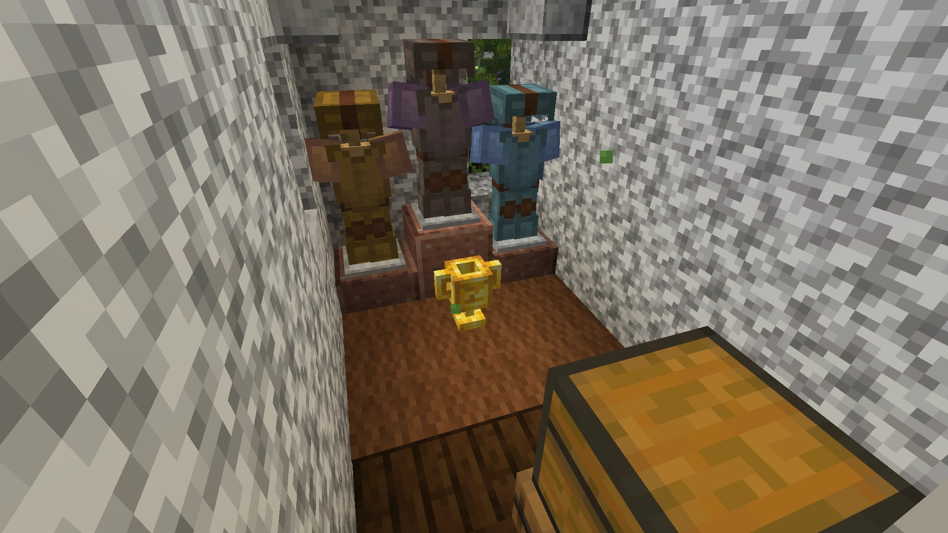 Against the wall stands a pedestal with three armor stands. BdoubleO100 had ImpulseSV enchant three leather armors, which he then colored in the corresponding colors (blue for water enchantment armor, yellow for fire protection armor, and grey for blast protection armor). However, due to the enchant effect, the colors were not clearly visible.[4] |