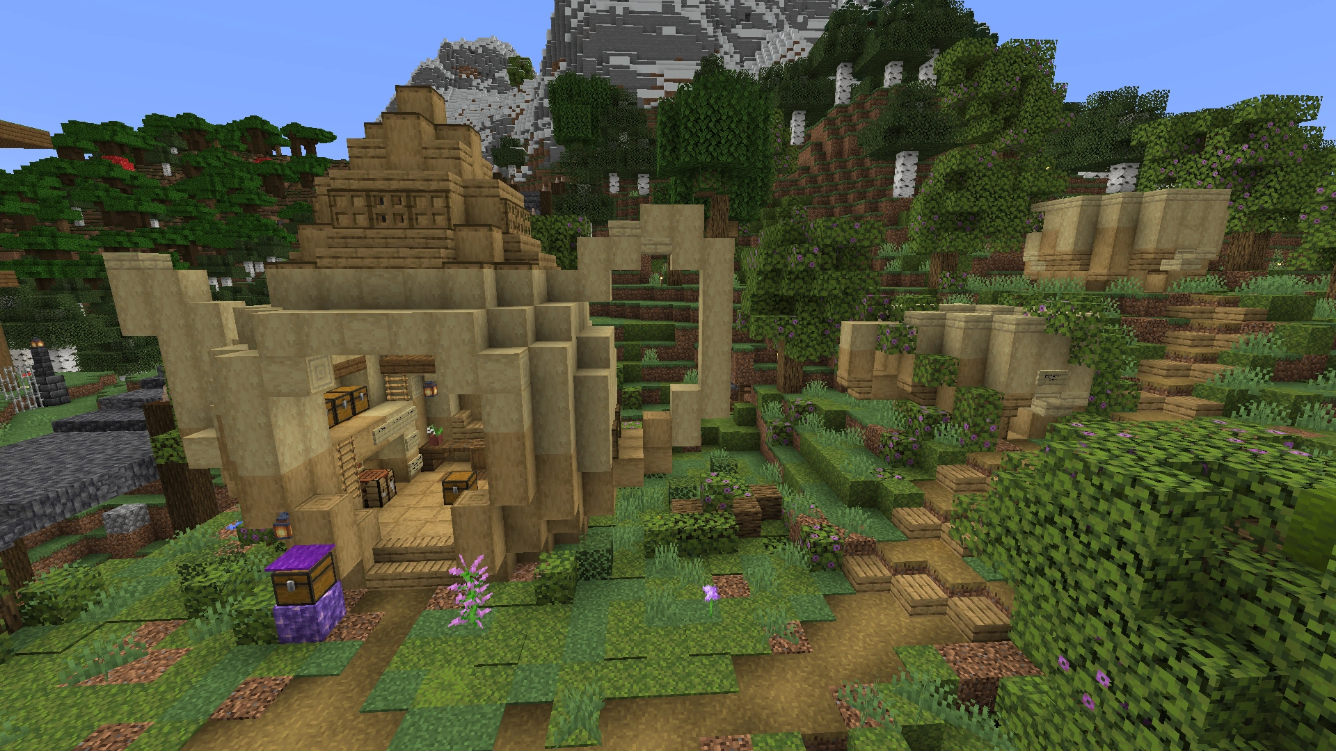 A small triangular moss-covered house built into the side of a mountain with a small wheat farm and wooden staircase up to a sheep and cow farm, with tents holding villagers. | Page needed |