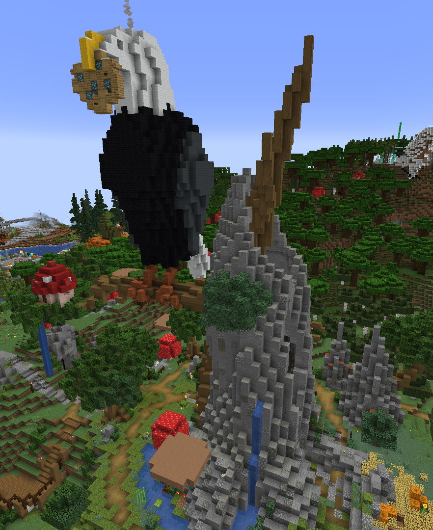 | Xisumavoid | A giant skull and ribcage made out of bone blocks sticking out the top of a mountain. The spine is flooded with water and a conduit allows him to use it as an elevator. The ribcage contains his massive copper converting machine named "David Copperfield the Fifth" which Pixlriffs helped him build during the Hermitcraft X Empires crossover. | Page needed | |